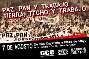 Más de 50 mil personas acompañarán el reclamo de Paz, Pan y Trabajo El próximo domingo 7 de agosto, en el marco de la festividad de San Cayetano, Barrios de … Sigue leyendo Barrios de Pie y otras organizaciones sociales de Liniers a Pza de Mayo