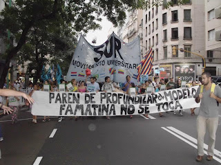 Ayer por la tarde se realizó una movilización desde Callao y Corrientes a la Casa de La Rioja y la de Catamarca, organizada por el Movimiento Libres del Sur y el Movimiento Universitario Sur para denunciar el perjuicio de los proyectos de megaminería auspiciados por la política kirchnerista.