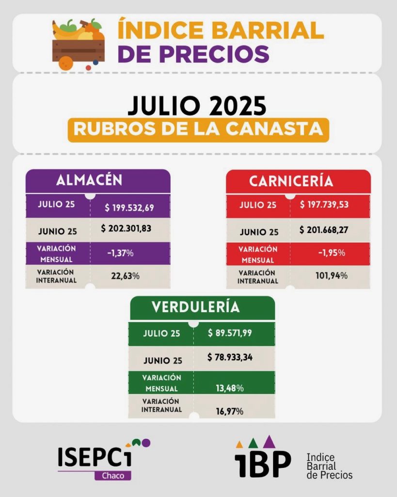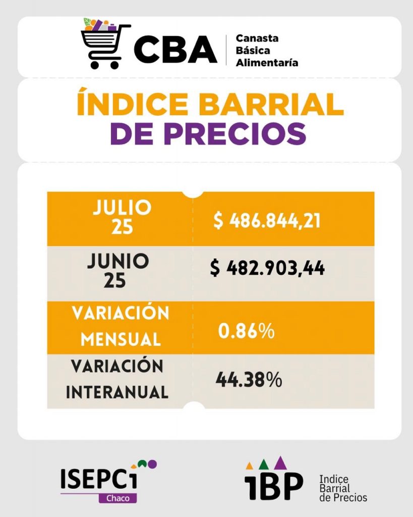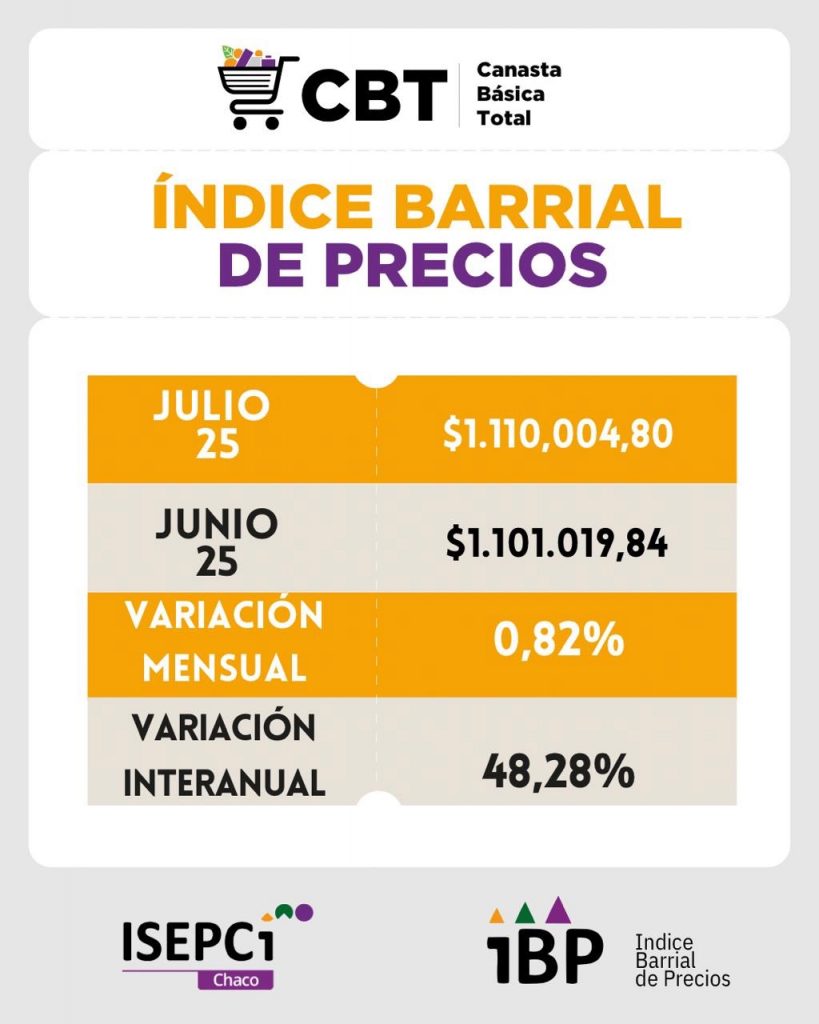 El Instituto de Investigación Social, Económica y Política Ciudadana (ISEPCi) informó que en julio de 2025 la Canasta Básica Total (CBT) en el Gran Resistencia y Sáenz Peña alcanzó los $ 1.110.004,80. Esto implicó un aumento mensual del 0,82% o $ 8.985 respecto a junio y una variación interanual del 48,28%, equivalente a $ 361.405 más que en julio de 2024.